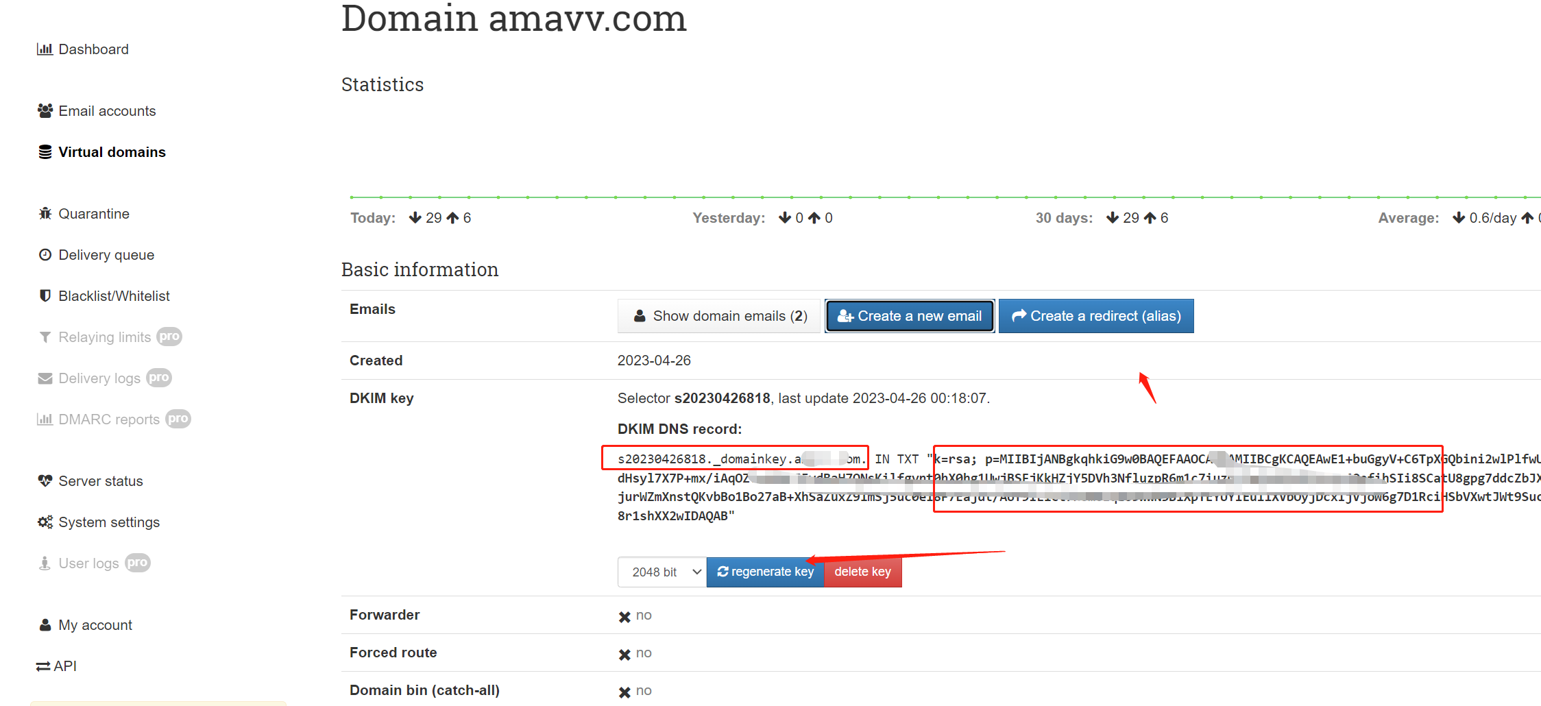 点击 DKIM keys,然后点击 Generate new key,生成 key,添加到 DNS 解析记录,就是上面最后一条解析 _s20160910378._domainkey.your-domain.com