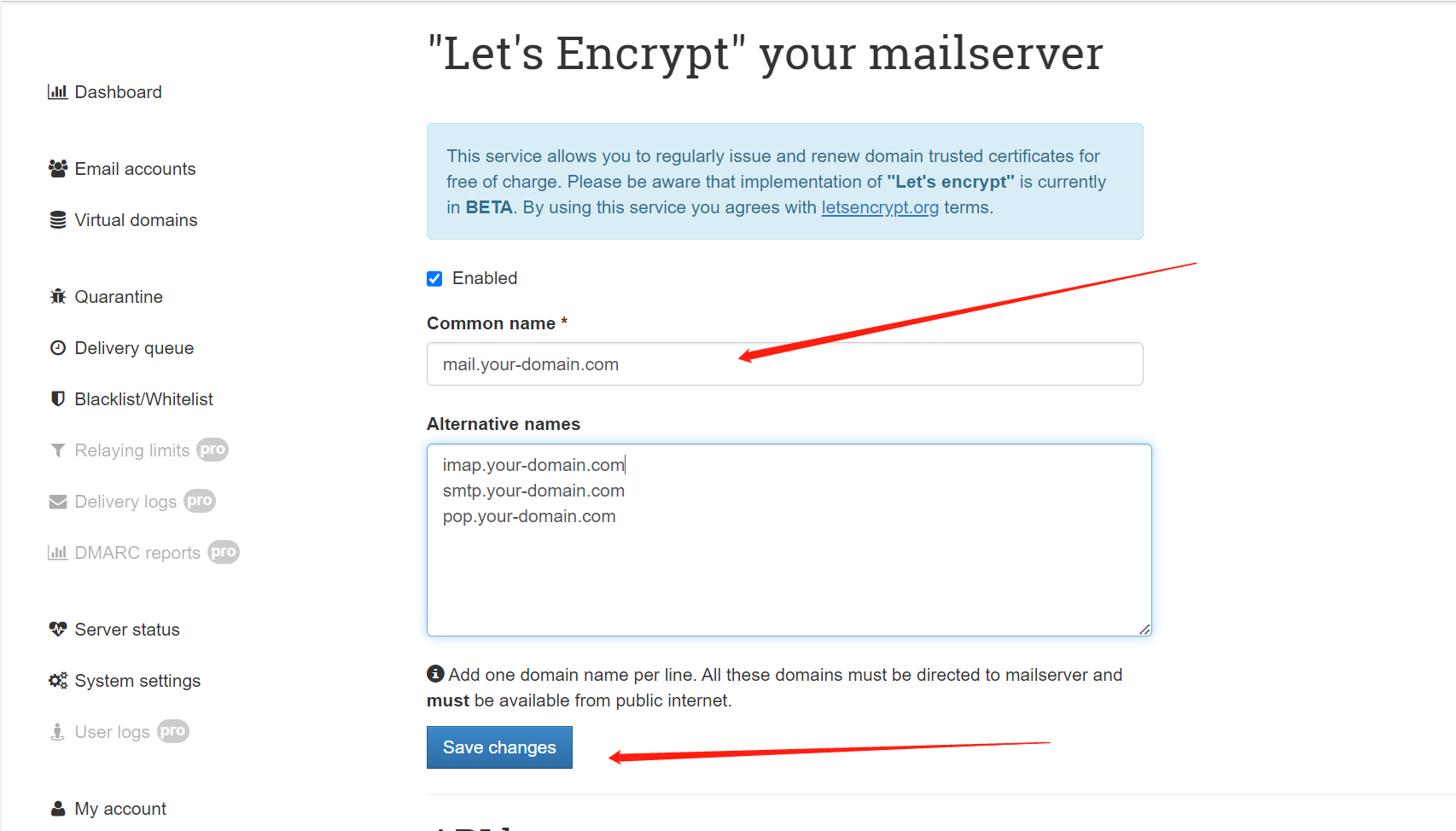 左侧点击 Virtual domains 然后点击域名进行配置。