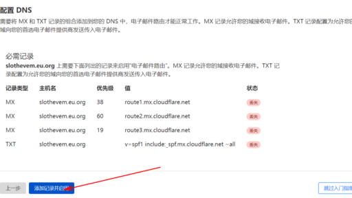使用国内邮箱有很大概率接收不到国外的服务商所发的邮件,而使用Gmail或Outlook之类的国外邮箱服务商又注册不到满意的用户名,故介绍如何使用自己的域名和Cloudflare的邮件转发实现自定义域名邮箱 一个域名,最好是com/net/org之类的国际通用域名 一个Cloudflare账号 一个接收邮箱 选择你打算做域名邮箱的域名 点击电子邮件选项 填入信息 进入你的收取邮箱验证 添加记录并启用 接下来就可以愉快的使用自定义域名邮箱来接收各种注册或订阅邮件了,当然国内外都可以